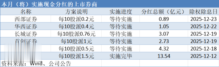 进入本周,上市券商现金分红加速落地,率先分红的是兴业证券。根据安排,该公司将在12月18日实施中期权益分派,方案为“10派0.5元”,累计派现约4.32亿元。紧接着,19日,长城证券、首创证券同日实施分红,前者“10派0.76元”,派现合计3.07亿元,后者“10派1元”,派现总额2.73亿元。